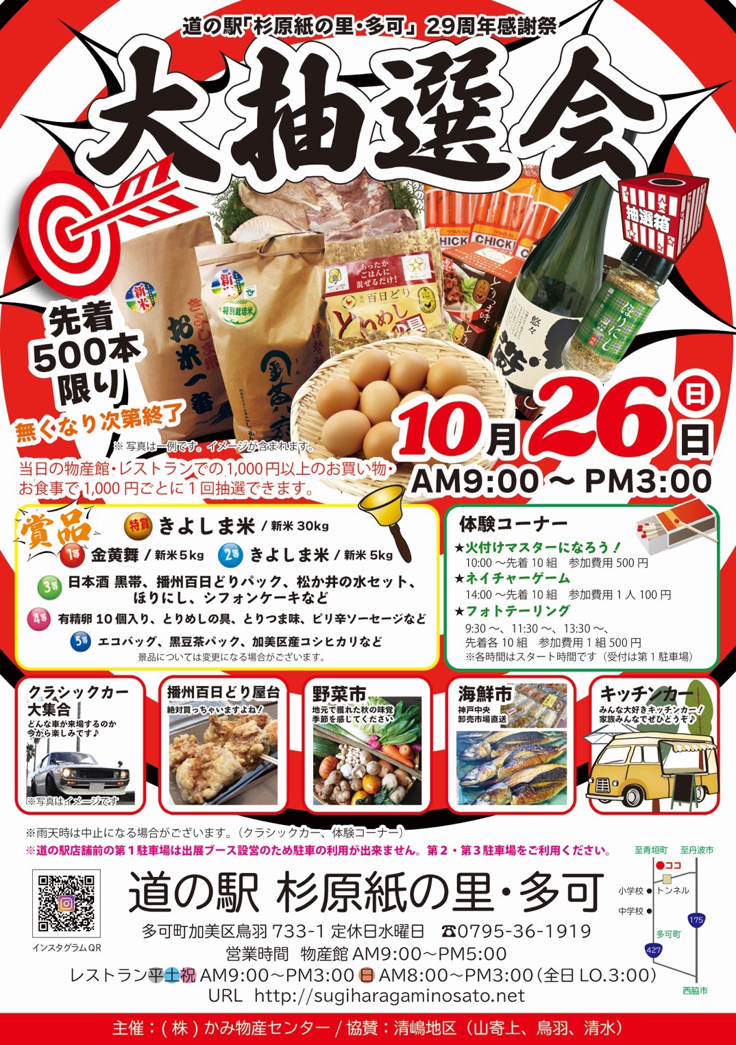 ・クラシックカー勢揃い ・播州百日鳥の屋台 ・とれとれ新鮮!播州地卵販売 ・神戸中央卸売市場直送 海産物販売! ・杉原川の清流で育った きよしま米(金黄舞) ・ラベンダーパーク産 ラベンダー製品! ・杉原紙手すき体験 実施!